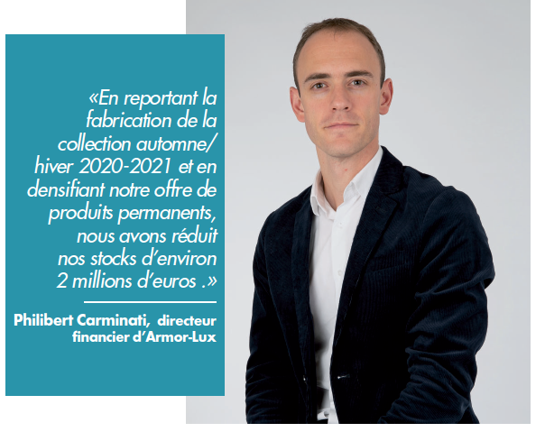 D’autre part, nous avons amélioré notre besoin en fonds de roulement. Afin de réduire nos stocks, nous avons choisi de reporter la fabrication – au sein de nos sites de productions à Quimper et à Troyes – de la collection automne-hiver 2020-2021, qui est habituellement mise en magasin pendant l’été. Nous avons choisi de vivre sur nos stocks et de les écouler. Nous avons également poursuivi notre stratégie de densification de notre offre de produits permanents, mise en place depuis trois ans. Ainsi, nous avons réduit nos stocks d’environ 2 millions d’euros. Au début du confinement, les impayés sur nos détaillants multimarques se sont envolés. Nous avons essayé d’être compréhensif avec nos revendeurs historiques mais la situation était telle que nous avons dû, parfois, faire preuve de fermeté, notamment en refusant de nouvelles commandes en cas de non-paiement. En parallèle, nous avons tenu à respecter les délais de règlement à l’égard de nos fournisseurs.