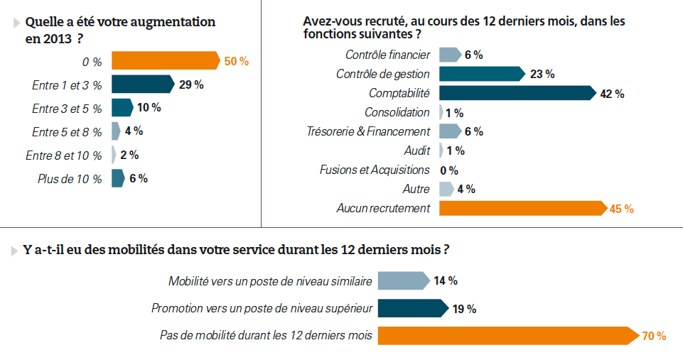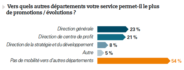 Au-delà des problématiques de rémunération, les directeurs financiers ont cette année encore – en termes de gestion des collaborateurs – pu compter sur la fidélité de leurs équipes. La majeure partie d’entre eux (55 %) estime que la fréquence moyenne de départ, au sein de leur direction financière est supérieure à cinq ans. Par ailleurs, les directions financières sont restées plutôt stables dans leur composition. 70 % des responsables de la fonction finance n’ont ainsi constaté aucune mobilité interne dans leur équipe. Pour les autres, seuls 19 % ont vu un ou plusieurs collaborateurs évoluer vers un poste de niveau supérieur, tandis que 14 % ont rejoint une fonction d’un niveau similaire. Dans l’ensemble, ces mobilités ont principalement concerné les métiers de la comptabilité et surtout du contrôle de gestion. Cette dernière fonction est d’ailleurs, avec celle de contrôleur financier, le meilleur moyen d’être promu au sein de la direction financière, voire vers des services opérationnels.