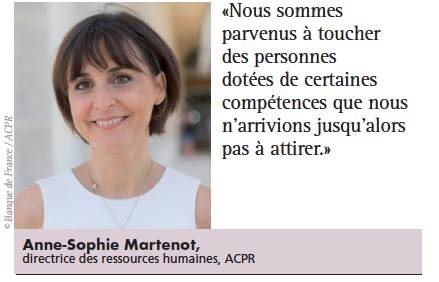 «Nous faisons face à une actualité particulièrement riche.» Comme l’exprime Anne-Sophie Martenot, directrice des ressources humaines de l’Autorité de contrôle prudentiel et de résolution (ACPR), les sollicitations ne manquent pas pour les équipes de l’organe en charge de superviser les banques et les assureurs. Un regain d’activité perceptible depuis plusieurs mois déjà et qui s’explique notamment par les besoins croissants liés à la surveillance des banques dans le cadre de l’Union bancaire, par l’application de la directive Solvabilité 2 mais aussi, et surtout, par le surcroît de demandes d’agréments de la part d’institutions financières provoqué par le Brexit… Afin d’y répondre dans les meilleures conditions possibles, l’ACPR s’est donc résolue à rehausser son quota en matière de recrutement. «Alors que nous avions embauché, en dehors des concours proposés chaque année par la Banque de France, une quarantaine de collaborateurs l’an dernier, nous prévoyons d’en attirer une centaine environ en 2019», explique Anne-Sophie Martenot. L’effectif actuel de l’ACPR avoisine 1 000 personnes. Mais l’ambition de la direction des ressources humaines n’est pas uniquement quantitative. «Nos missions évoluent, s’élargissent et se complexifient», poursuit Anne-Sophie Martenot. Parmi les profils les plus recherchés figurent des actuaires et des spécialistes en conformité, en audit bancaire ou encore en maîtrise des risques. «En outre, l’abondance des données transmises par les banques et les assurances nous conduit à nous appuyer sur davantage de profils ingénieurs/experts en data», ajoute Anne-Sophie Martenot.