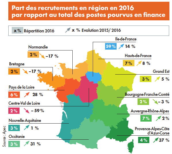 Trouver un poste financier en dehors de Paris : c’est possible ! Si en 2016, 59 % des recrutements de cadres en finance, comptabilité, contrôle de gestion et audit se sont concentrés sur l’Ile-de-France, certaines régions françaises ont vu leurs embauches progresser fortement. Ainsi, les recrutements dans ces métiers en PACA ont augmenté de 37 % en 2016, de 31 % en Occitanie et de 29 % dans les Pays de la Loire, selon les données de l’Apec (voir graphique).