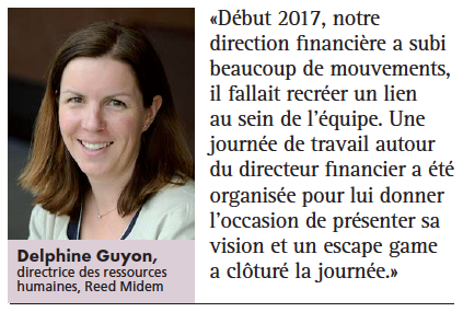 Toutefois, le team building fonctionne également par direction. «Tous les deux mois, j’emmène mon équipe se mettre au vert pendant deux jours, toujours dans des lieux variés, explique Judith Jiguet. Malgré une charge de travail parfois lourde, j’impose ce moment de partage qui lie l’équipe grâce à un temps de travail collaboratif sur notre vision et notre stratégie et un moment de convivialité pour mieux nous connaître : un escape game ou une troupe d’improvisation théâtrale par exemple.» C’est le cas également de certaines directions financières qui usent de cette méthode. «Début 2017, la direction financière a subi beaucoup de mouvements, il fallait recréer un lien au sein de ce département, indique Delphine Guyon. Aussi, une journée de travail autour du directeur financier a donc été organisée pour lui donner l’occasion de présenter sa vision et un escape game a clôturé la journée. Cela a permis une meilleure compréhension des objectifs et le sentiment d’appartenir à la même équipe.»