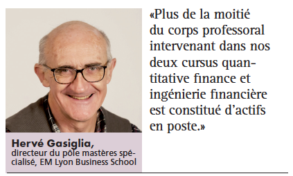 Le niveau élevé de compétence acquis par les élèves est également lié à la très forte proximité de ces programmes avec les institutions financières et les entreprises.«Plus de la moitié du corps professoral intervenant dans nos deux cursus quantitative finance et ingénierie financière est constitué d’actifs en poste, détaille Hervé Gasiglia, directeur du pôle mastères spécialisé d’EM Lyon Business School. Outre l’apport qualitatif sur le contenu pédagogique des cours, cette proximité avec le marché du travail garantit à notre formation une visibilité constante et entretient sa réputation.» Sur le plan de la recherche d’emploi, la plupart des établissements proposent, parallèlement au volet théorique, des séances de coaching dispensées par des spécialistes de l’insertion professionnelle, dédiées notamment à la rédaction de curriculum vitae, à la valorisation de candidature et à la préparation aux entretiens de recrutement.