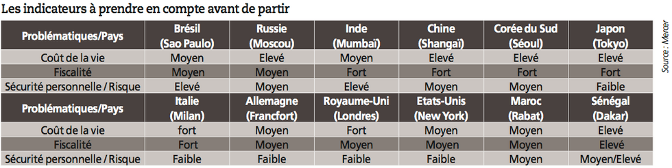 «De plus, les particularités défavorables de certains pays, allant de l’isolement au risque de menaces physiques, sont prises en compte dans la rémunération, explique Paul Mercier, directeur chez Michael Page. Elles donnent droit à des suppléments de salaires proportionnels aux difficultés rencontrées, dites “hardship allowances”.»Quoi qu’il en soit, le futur expatrié a alors intérêt à collecter des informations sur les pays concernés, notamment en contactant des collègues sur place mais aussi l’ambassade ou le consulat de France, afin de connaître non seulement les conditions de vie mais aussi le niveau de pouvoir d’achat local.