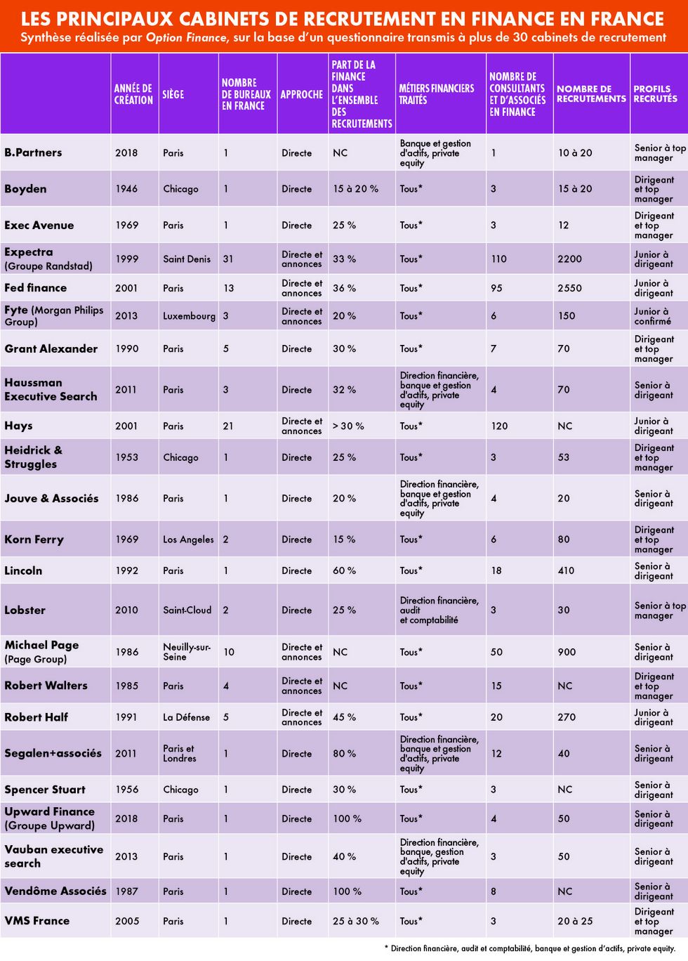 A Paris, une quarantaine de cabinets se disputent cette nouvelle manne en finance. Si le secteur reste atomisé, il se structure néanmoins en trois grandes catégories d’acteurs (voir tableau) : cinq grands cabinets internationaux qui se concentrent principalement sur la chasse de dirigeants – les big 5 du recrutement, baptisés les « Shrek » pour Spencer Stuart, Heidrick & Struggles, Russel Reynolds, Egon Zehnder et Korn Ferry ; des boutiques françaises, s’adressant aux dirigeants, mais aussi à des profils de middle management et senior ; et une dizaine de cabinets de plus grande taille associant approche directe et publication d’annonces, recrutant tous types de profils, même juniors. Enfin, quelques chasseurs de têtes indépendants, travaillant avec une poignée de clients, complètent le marché.