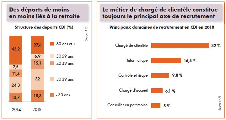 «Auparavant, les employés des banques restaient de nombreuses années, voire toute leur carrière, dans la même banque, profitant ainsi des possibilités d’évolution offertes dans leur groupe, rappelle Frederic Hatsadourian, responsable de la partie banque de détail chez Robert Walters. Mais désormais, comme dans de nombreux autres secteurs, les salariés sont de plus en plus mobiles et n’hésitent pas à quitter la banque pour une autre structure, qu’il s’agisse d’un autre établissement bancaire ou d’un secteur différent.» D’après l’Association française des banques (AFB), qui ne tient pas compte des banques mutualistes, les moins de 40 ans ont concentré plus de la moitié des départs en 2018.