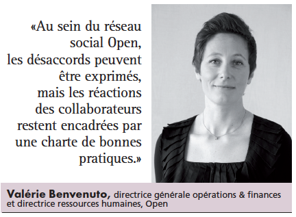 Autre prérequis : il faut accompagner et porter le déploiement de ces outils, via par exemple la création de communautés. «Pour fonctionner, les communautés au sein des réseaux sociaux d’entreprise requièrent un sponsorship fort et des animateurs capables de les faire vivre», poursuit Valérie Benvenuto. Groupes ouverts ou fermés, organisés autour d’une thématique ou d’un métier, il existe aujourd’hui une centaine de communautés vraiment actives au sein du groupe Open : «Les plus fréquentées comptent entre 50 et 300 membres, commente Valérie Benvenuto. Environ la moitié des salariés du groupe se connectent régulièrement au réseau social qui n’est que l’une des fonctionnalités de notre plateforme collaborative.»