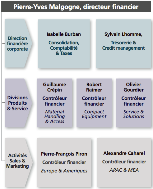 Les autres métiers de la direction financière sont également concernés – mais dans une moindre mesure que le contrôle de gestion – par la mise en place de la nouvelle organisation de Manitou. Avec la création d’une division dédiée au financement des ventes, le service de trésorerie va devoir développer de nouvelles solutions financières (de location et de leasing notamment), avant de les étendre progressivement à l’ensemble des filiales du groupe.