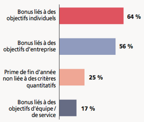 Si les primes variables sont en repli, leur nature n’a pas particulièrement évolué. Ainsi, les bonus liés à des objectifs individuels demeurent les plus utilisés par les entreprises : 64 % des directeurs financiers en bénéficient. Ils sont 56 % à avoir des primes liées aux objectifs de leur entreprise, et 25 % à recevoir des primes qui ne dépendent pas de critères quantitatifs.