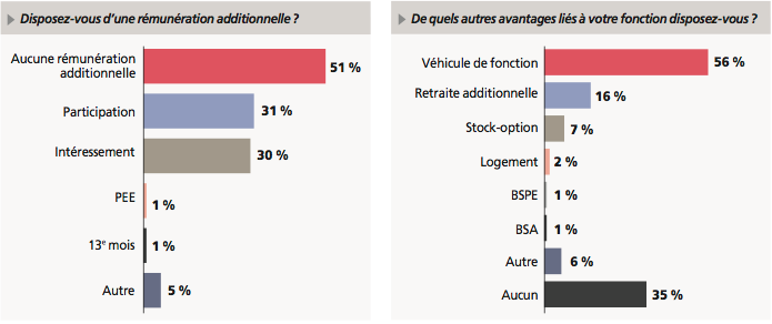 Les contraintes budgétaires affectent également les rémunérations complémentaires. Ainsi, en ce qui concerne la part de variable, 27 % des directeurs financiers interrogés ne s’en sont pas vu attribuer cette année, soit 6 points de plus qu’il y a un an. De même, la part des professionnels qui disent n’avoir reçu aucune rémunération additionnelle, autre que la part variable, s’élève désormais à 51 %, contre 46 % l’année dernière. Ils sont ainsi moins nombreux à profiter de régimes de participation (31 % contre 39 %, en 2013) et d’intéressement (30 % contre 34 %).
