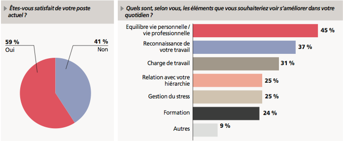 Mais visiblement, ce type de compensation ne suffit pas. En effet, le taux de satisfaction des directeurs financiers continue progressivement de baisser. Alors que 66 % d’entre eux s’estimaient satisfaits de leur poste en 2012, puis 62 % l’année dernière, cette part est tombée à 59 % cette année. «Sans être fondamentalement mécontents, les directeurs financiers doivent prendre leur mal en patience sur le plan pécuniaire alors que le contexte économique ne s’améliore pas aussi rapidement qu’espéré», constate Mikaël Deiller.
