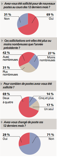 Un sentiment qui peut même pousser ces derniers… à quitter leur poste. Au cours des 12 derniers mois, un directeur financier sur trois parmi ceux interrogés a changé d’emploi ! «Certes, le marché du recrutement des directeurs financiers présente très peu de création de postes, mais les directeurs financiers restent à l’affût des offres de remplacement sur le marché», explique Mikaël Deiller. Leur départ constitue une menace à prendre au sérieux par les entreprises. D’abord parce que les sollicitations sont nombreuses : sur un an, 69 % de ces professionnels ont été contactés pour de nouveaux postes. Ensuite, parce que cette population est mobile : 72 % se disent prêts à déménager en France ou à l’étranger pour une opportunité professionnelle. Les sociétés vont donc devoir faire preuve d’une attention plus marquée si elles veulent conserver leurs directeurs administratifs et financiers !
