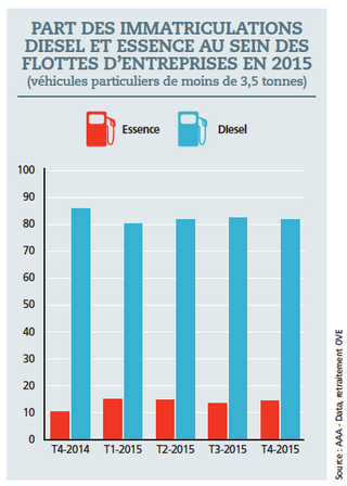 Sur le marché du véhicule d’entreprise, après la chute de la part du marché diesel enregistrée début 2015, la situation s’est stabilisée sur le reste de l’année. L’OVE souligne même une légère accélération des ventes de véhicules diesel au dernier trimestre 2015, avec une progression de 1,1 % à fin octobre, 2,2 % à fin novembre et 3,8 % à fin décembre. Une accélération qui se poursuit depuis le début de cette année (+ 10,3 % sur les ventes des véhicules particuliers et véhicules utilitaires sur les deux premiers mois de 2016). Ces chiffres sont la preuve que les modèles diesel restent appréciés des gestionnaires de flottes, notamment en raison de leurs qualités pour les gros rouleurs (les entreprises parcourent en moyenne 30 000 kilomètres par an). Fin 2015, la part de marché du diesel sur le segment des véhicules particuliers (VP) en entreprises atteignait 80,61 %, et 87,35 % si l’on inclut les véhicules utilitaires (VU). Le diesel, autrefois énergie incontestée dans les entreprises en raison notamment d’une fiscalité avantageuse, cède néanmoins du terrain mois après mois. Fin janvier, en incluant les VP et les VU, le diesel représentait 85,22 % des immatriculations. La bascule du marché en faveur des motorisations essence n’est cependant toujours pas d’actualité.