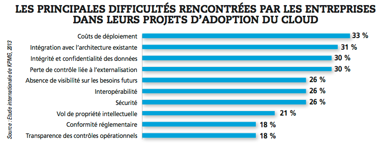 Aujourd’hui, force est de constater que la réduction des coûts informatiques reste l’une des premières motivations des entreprises qui basculent vers le cloud. 48 % des entreprises interrogées dans le cadre d’une étude KMPG en 2013 considèrent la réduction des coûts comme la principale raison de leur passage au cloud, suivie par la vitesse d’adoption de cette technologie (28 %). Sept entreprises sur dix sont plutôt d’accord ou tout à fait d’accord pour dire que l’environnement cloud a permis une réduction significative des coûts. Mais les réflexions sur le sujet dépassent maintenant largement ce simple cadre financier. Transformation de la DSI, modernisation des infrastructures informatiques, évolution des modèles applicatifs et des modèles de services, modifications des processus de facturation et de paiement des services IT sont désormais autant de sujets liés au cloud sur lesquels se penchent les entreprises des secteurs privés et publics.