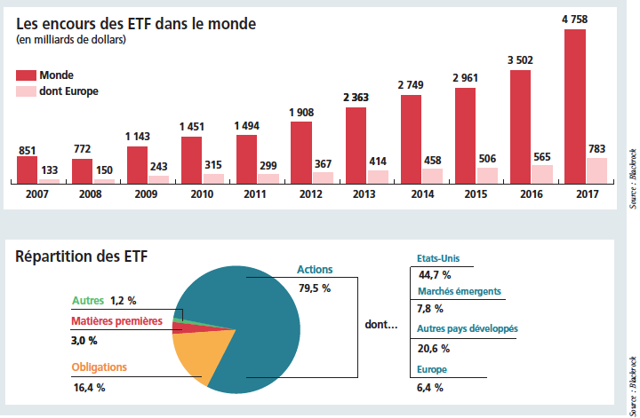 Les ETF ne cessent de séduire les investisseurs, notamment les institutionnels, mais aussi à un degré moindre les particuliers. Leurs encours approcheraient dans le monde les 5 000 milliards de dollars (dont environ 780 milliards en Europe) selon la dernière enquête de Blackrock.