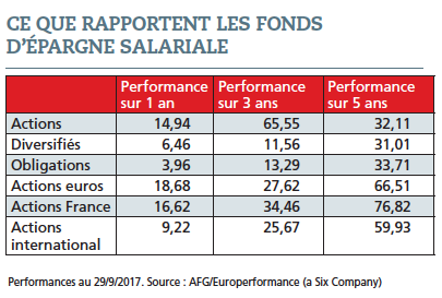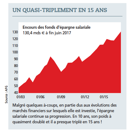 Quoi qu’il en soit, les fonds diversifiés représentent désormais 62 % des encours de l’épargne salariale (81 milliards d’euros), alors que les fonds d’actionnariat salarié pèsent pour 38 % (49 milliards d’euros). L’AFG note qu’à mi-2017, les encours des fonds diversifiés ont progressé de 7,5 % sur six mois et 9,5 % sur un an, alors que les encours des fonds d’actionnariat ont enregistré une progression de 4 % sur le premier semestre 2017, mais de 14 % sur un an. «Au total, note l’AFG, la part de l’épargne salariale investie en actions représente 60 % du total dont 40 % via les fonds d’actionnariat salarié et près de 20 % via les fonds actions et diversifiés.»