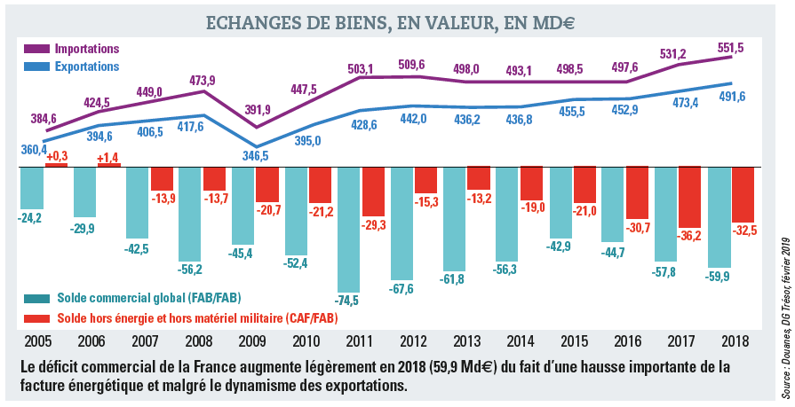 Malgré une conjoncture économique qui en 2018 aurait pu lui être favorable, la France peine donc à rétablir sa balance commerciale depuis quelques années. Elle souffre notamment du manque de compétitivité de ses entreprises qui, au début du XXe siècle, ont pâti de la concurrence des pays émergents comme la Chine, ou encore de la crise de 2008.