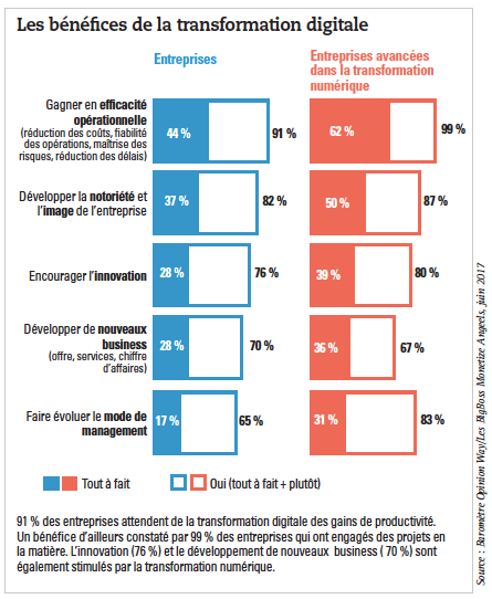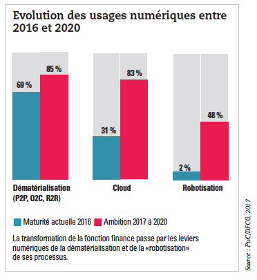 Selon l’étude PwC/DFCG «Priorités 2017 du directeur financier», entre 2016 et 2020, les technologies plébiscitées par la fonction finance seront ainsi liées aux outils de dématérialisation, au cloud mais aussi à la robotisation. 66 % des directeurs financiers estiment que la dématérialisation permet à la fonction finance d’être plus efficace. Dans les outils de pilotage, la dématérialisation leur permettra d’automatiser le processus de revue des écritures manuelles (57 %), de lisser le pic d’activité pendant la clôture (44 %) et de standardiser le processus de clôture (33 %). Par ailleurs, 83 % des directeurs financiers pensent que le cloud sera un incontournable du système d’information finance. La question de la sécurité des données reste une préoccupation forte mais n’est plus un frein. Le cloud leur permettra par ailleurs de réduire leur coût informatique (42 %), de fiabiliser les données (33 %) et de déployer plus facilement de nouveaux outils (30 %). Enfin, 48 % des directeurs financiers considèrent que la robotisation permettra à la fonction finance de gagner en efficacité et d’améliorer le contrôle interne. Elle permettra par exemple d’administrer le référentiel, les commandes et/ou litiges clients, de contrôler les interfaces, de calculer et d’enregistrer les écritures comptables ou encore d’identifier et d’analyser les alertes.