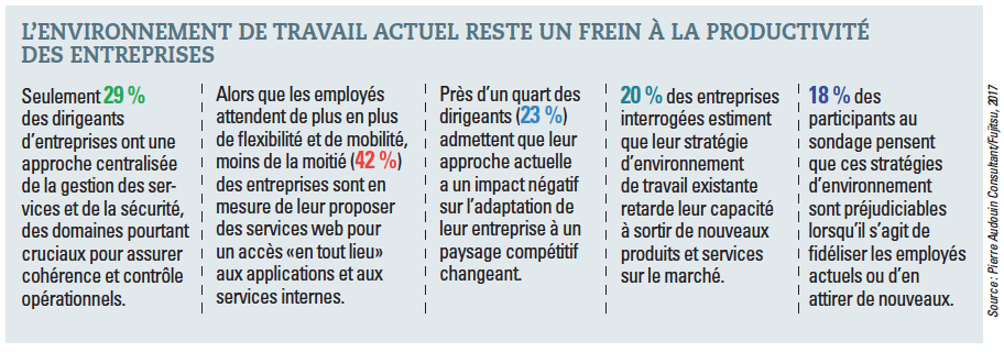 Malgré de nombreux projets de refonte des stratégies actuelles visant à répondre aux exigences de l’environnement de travail de demain ainsi qu’aux évolutions métiers, les entreprises restent néanmoins à la traîne sur ce sujet. Selon une étude monde Pierre Audoin Consultants (PAC) réalisée en 2017 pour Fujitsu, beaucoup de décisions relatives aux environnements de travail actuels constituent avant tout des obstacles à leur évolution. Les résultats de cette étude montrent qu’en plus de la sécurité, les entreprises sont également confrontées à des problèmes de technologies obsolètes et à des environnements de travail incapables de supporter de nouvelles méthodes. Par ailleurs, les entreprises ne progressent que lentement vers un environnement de travail adapté aux exigences de demain, ne parvenant pas à moderniser de nombreux processus essentiels. «Nous sommes aujourd’hui à l’aube d’une révolution de l’environnement de travail, analyse Ramanan Ramakrishna, head of service innovation and portfolio chez Fujitsu EMEIA. Les fondations posées par les entreprises, à la fois en termes de technologies et de changements culturels, auront un impact sur leur compétitivité future. Même si les organisations progressent, le chemin est encore long. Si ces tendances décisives ne font pas l’objet de stratégies efficaces de redéfinition de l’environnement de travail, les entreprises risquent de voir leurs gains à court terme éclipsés par les coûts à long terme, sans parler d’une incapacité grandissante à attirer les talents ou à répondre aux exigences en matière de réglementation.»