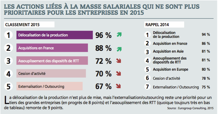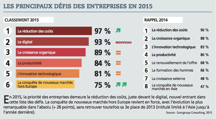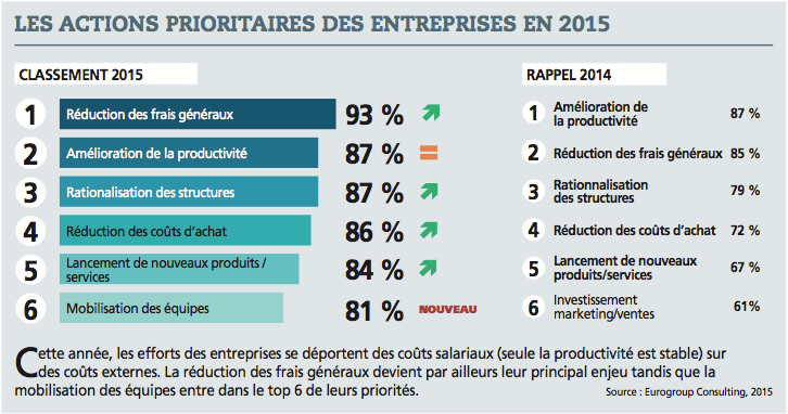 Marqués par un contexte économique qui demeure morose et par une multiplication des facteurs de risques externes (situation économique incertaine, contraintes sociales et fiscales, risques géopolitiques), les dirigeants d’entreprises continuent de faire preuve de pragmatisme et de prudence, et plébiscitent plus que jamais la réduction des coûts. «Dans un environnement où la croissance est susceptible de rester molle, diluée et contrastée pour un moment encore, la problématique de baisse des coûts est plus que jamais un enjeu majeur au maintien et au développement des entreprises», souligne ainsi Sylvain Maccotta, expert en finance et frais bancaires chez Cosma-Experts. Selon le baromètre Eurogroup Consulting, l’optimisation des coûts conforte d’ailleurs en 2015 sa première place acquise en 2014 au rang des priorités des entreprises, avec un gain de 7 points et une quasi-unanimité des répondants.