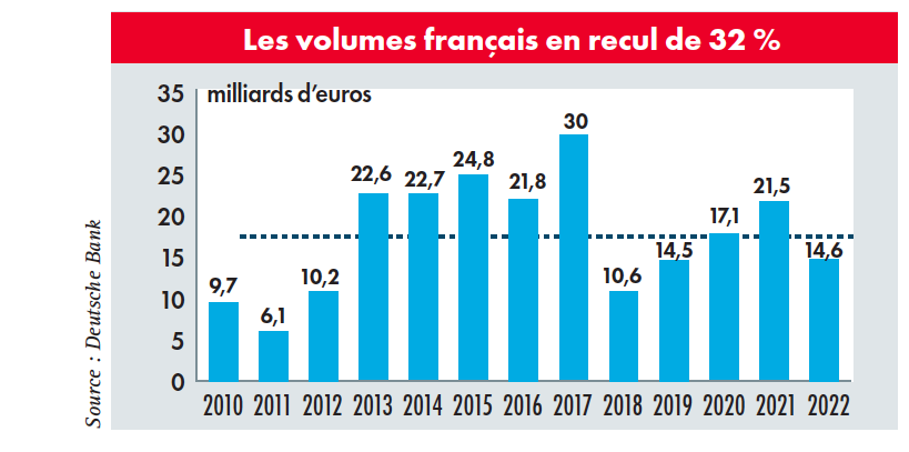 En matière d’introductions, 2022 n’avait pas débuté de la meilleure des manières. « Les entreprises tech qui s’étaient introduites en Bourse en 2021 (OVH, Believe ou Aramis par exemple) ont enregistré des performances post-IPO décevantes. Cela n’avait pas incité d’autres candidats poten- tiels à engager les travaux de préparation en vue d’une cotation », rappelle Jean-Baptiste Bureau, head of ECM France et Europe du Sud chez HSBC. La dégradation des conditions de marché provoquée par l’invasion de l’Ukraine et par le tour de vis des banques centrales pour lutter contre l’inflation n’a ensuite pas aidé. Les rares actionnaires qui avaient, un temps, envisagé la mise en Bourse d’un actif y ont finalement renoncé, à l’image par exemple de Casino qui a préféré céder GreenYellow (fournisseur et producteur d’électricité français) à un fonds. « Dans ce contexte, il est intéressant de noter que les deux seules IPO de taille significative de l’année en France ont concerné deux opérations de “despacking” : Deezer et Teract », signale Julien Fabre, coresponsable de la banque d’affaires Deutsche Bank pour la France. Le despacking correspond à l’opération par laquelle un Spac acquiert ou fusionne avec une société opérationnelle. Pâtissant du manque d’intérêt des investisseurs pour de « nouvelles histoires », les cours du spécialiste du streaming musical et du réseau d’enseignes et de marques dans les domaines de la jardinerie, l’animalerie et l’alimentaire ont toutefois respectivement plongé de plus de 60 % et 30 % depuis. Au total, seuls 500 millions d’euros ont été levés dans le cadre d’IPO, contre 4 milliards un an plus tôt.