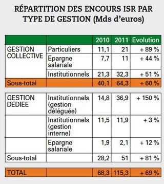 Quoi qu’il en soit, les encours ISR ont en 2011 franchi le cap des 100 milliards d’euros pour s’établir précisément à 115,3 milliards. Un seuil symbolique qu’il convient logiquement de saluer mais qui toutefois dissimule une menace. Dans la mesure où les fonds monétaires représentent 34 % des encours ISR (contre 44 % pour les produits obligataires et 24 % pour les actions), si les investisseurs venaient à se détourner de cette classe d’actifs en raison notamment de performances jugées inadaptées à leurs besoins car trop faibles, les encours ISR seraient donc fatalement appelés à baisser de manière importante. Il ne faudra pas pour autant en déduire que ces mêmes investisseurs se détournent des problématiques ISR. Il s’agira simplement de choix liés à l’optimisation de leurs allocations d’actifs !