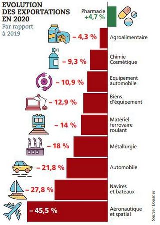 Un chiffre qui cache deux mouvements massifs : de par les moindres déplacements mais aussi la chute d’activité générale, la facture énergétique s’est allégée de l’ordre de 17 milliards d’euros sur les 11 premiers mois de 2020. En revanche, les exportations aéronautiques et automobiles se sont effondrées et transforment un excédent sectoriel des matériels de transport d’environ 14 milliards d’euros en un déficit de près de 2 milliards d’euros sur la même période. La facture énergétique a certes été divisée par deux l’an passé, mais globalement, sur l’année, la France a perdu 82 milliards d’euros d’exportations, dont 35 milliards pour les seuls matériels de transport. « Des chiffres mauvais », reconnaît le ministre du Commerce extérieur et de l’Attractivité, Franck Riester, qui préfère néanmoins mettre en avant « la dynamique depuis avril 2020 ».
