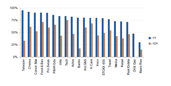 L’amélioration des chiffres et la hausse des dépenses d'infrastructures devraient soutenir les secteurs tels que les banques, la construction et les matériaux, qui génèrent la plupart de leurs revenus au niveau national. Les banques, en particulier, pourraient représenter une manière peu coûteuse de jouer la relance de la zone euro, bien que 80% d'entre elles soient sur le point de renouer avec leurs plus hauts à 1 an. Seulement 17% sont à moins de 10% de leurs plus hauts à 10 ans.