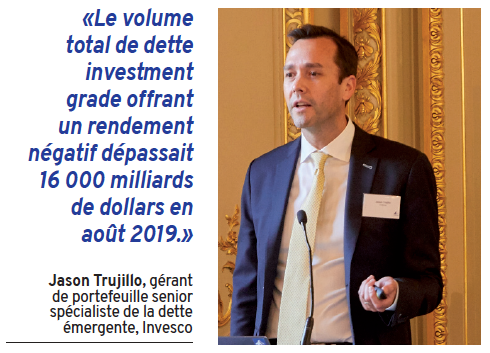 L’allocation d’actifs pratiquée par les assureurs n’est pas seulement le reflet d’analyses de marché, mais aussi d’un empilement de contraintes, allant de la réglementation Solvabilité II, en passant par les normes comptables ou encore l’intégration croissante des critères ESG, aujourd’hui utilisés dans 53 % des actifs institutionnels européens, selon une récente étude menée par INDEFI. A ce contexte s’est ajoutée cet été une nouvelle baisse des taux dont les effets sont plus que conséquents, que Jason Trujillo, gérant de portefeuille senior spécialiste de la dette émergente chez Invesco résume en un chiffre : «le volume total de dette investment grade offrant un rendement négatif dépassait 16 000 milliards de dollars en août 2019.» Autrement dit : environ 30 % du gisement mondial.