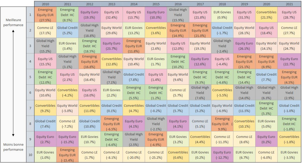 Dans le tableau ci-dessous, souvent utilisé pour illustrer les bienfaits de la diversification, nous voyons que les classes d'actifs affichent des performances très variables ; les gagnants et les perdants sont rarement les mêmes d'une année sur l'autre.