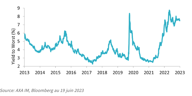 En Europe, où les rendements restent élevés, la question de savoir comment les entreprises vont faire face à la hausse des coûts de financement suscite de plus en plus d'attention. Malgré ces craintes, les fondamentaux des entreprises européennes restent eux aussi bien orientés : les bénéfices trimestriels ont été positifs au T4 2022 et les bénéfices du T1 2023 ont dépassé les attentes du marché. Dans ce contexte, nous percevons des opportunités dans le segment de la dette subordonnée de certains émetteurs Investment Grade.