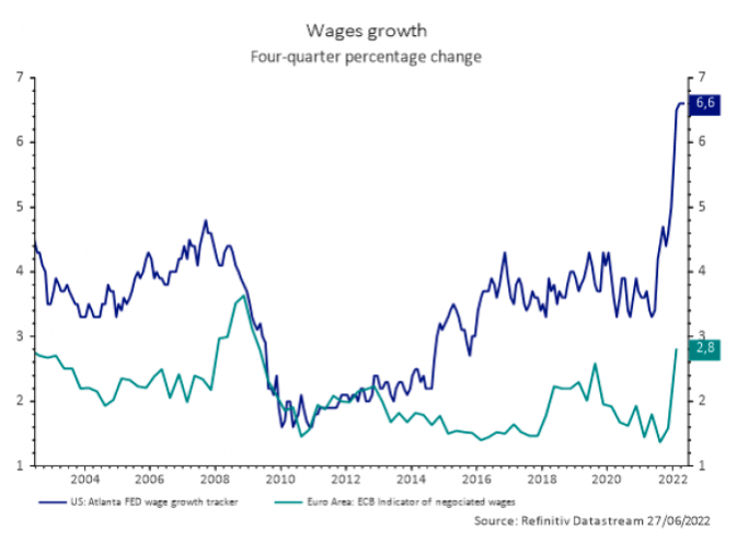 Tout cela n’est pas uniquement valable aux États-Unis. En juin, l'inflation a établi un nouveau record de 8,6 % en zone euro, après avoir atteint 9,1 % au Royaume-Uni en mai, où les prix ont progressé au rythme le plus rapide depuis 40 ans. (2) Or, ces pressions inflationnistes pourraient être renforcées par un marché du travail tendu. On constate déjà une hausse des salaires aux États-Unis, les employés réclamant un alignement sur l'inflation, tandis qu’un mouvement similaire émerge dans la zone euro. (3)