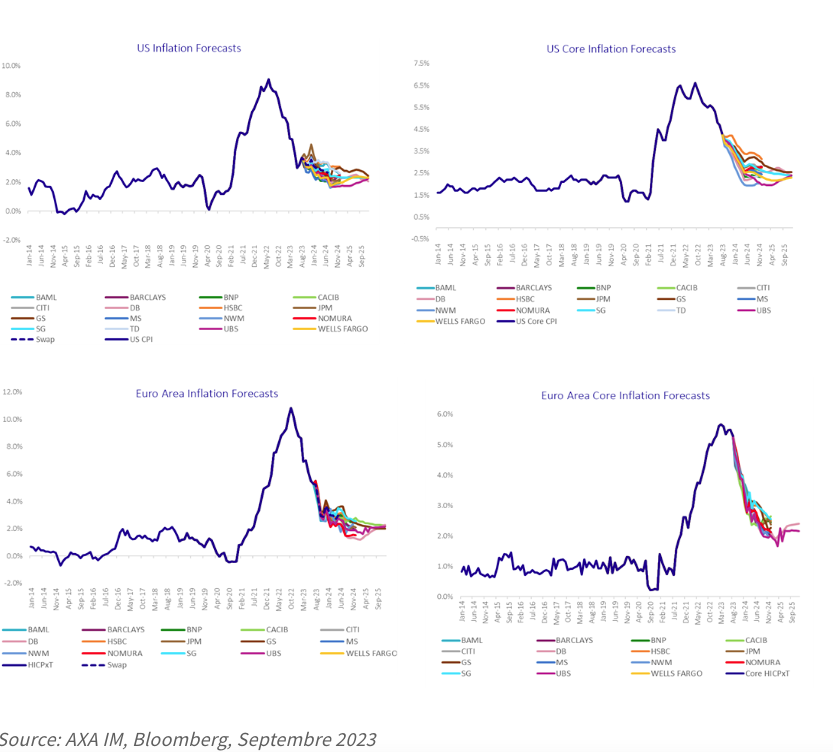 Néanmoins, comme le montrent les graphiques ci-dessous, les économistes continuent de tabler sur un retour de l'inflation à un niveau proche de l’objectif de 2 % d’ici fin 2024 et sur son maintien à des niveaux supérieurs à ceux de la période antérieure au Covid, en particulier dans la zone euro.