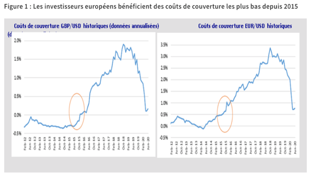 Après avoir atteint un sommet, les spreads se sont rétrécis, mais demeurent nettement supérieurs aux niveaux d'avant la crise, ce qui constitue à nos yeux une opportunité pour les investisseurs. Au 22 juillet, les spreads s'établissaient à 483 points de base (pb) en Europe, à 533 pb aux États-Unis et à 559 pb à l'échelle mondiale1. Quoiqu'inférieurs au pic atteint en mars (de 383 pb, 554 pb et 535 pb respectivement), ces niveaux n'en demeurent pas moins de quelque 200 pb plus élevés qu'en début d'année. En termes d'émissions, les États-Unis tiennent toujours le haut du pavé, et représentent plus de la moitié du marché du haut rendement à l'échelle mondiale. Les investisseurs britanniques et européens qui cherchent à mettre un pied sur le marché américain noteront que les coûts de couverture ont chuté (voir Figure 1). Après les plus hauts historiques de la fin 2018, les taux zéro effectifs de la Réserve fédérale signifient que les coûts de couverture de change se situent dorénavant à des planchers inédits depuis 2015.