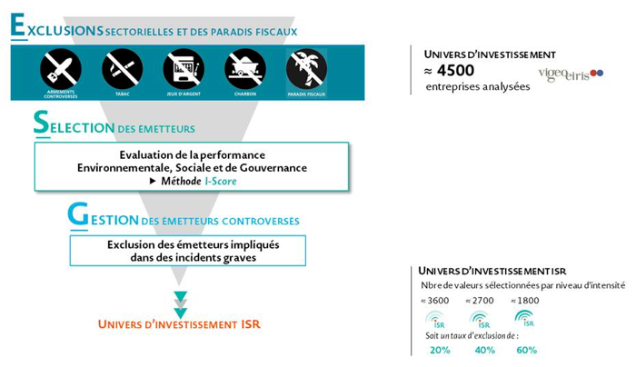 Depuis janvier 2019, Ecofi Investissements a renforcé son processus, avec 100% de sa gamme de fonds ouverts ISR*. Exclusions de certains secteurs (armement, tabac, jeux, charbon) et des paradis fiscaux, sélection des émetteurs les plus responsables au regard de leurs performances Environnementales, Sociales, et de Gouvernance (ESG) et gestion des émetteurs controversés sont les piliers de ce processus.