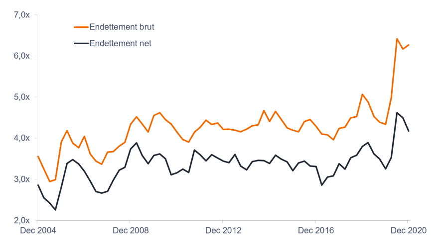 Ratio d’endettement brut = dette totale/bénéfices avant intérêts, impôts, dépréciations et amortissements (EBITDA). Ratio d’endettement net = dette nette (dette totale moins trésorerie et équivalents de trésorerie)/EBITDA. Les bénéfices s’entendent sur une base de 12 mois.