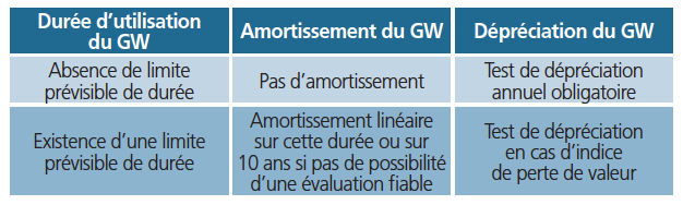 Le test de dépréciation consiste à comparer la valeur nette comptable (VNC) à la valeur actuelle. Une provision est constituée dans le cas où la VNC excède la valeur actuelle. Les dépréciations de GW sont irréversibles.