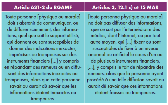 En matière de manipulation de marché par diffusion d’informations fausses ou trompeuses, l’entrée en vigueur, le 3 juillet 2016, du règlement « abus de marché » (MAR) n’a pas fondamentalement modifié la définition du manquement administratif qui se trouvait jusqu’alors exposée par l’article 631-2 du RGAMF et qui résulte désormais d’une combinaison des articles 3, 12.1 c) et 15 MAR.