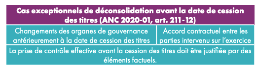 Conformément à l’art. 211-12 du règlement ANC 2020-01, la date de sortie de périmètre correspond à la date de perte de contrôle de la filiale. Elle coïncide le plus souvent avec la date de cession des titres et donc au transfert des droits de vote attachés sauf cas très exceptionnels2.