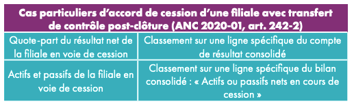 Pour des raisons de comparabilité, la quote-part du groupe dans le résultat net de la filiale cédée peut être présentée sur ligne spécifique du compte de résultat (art. 242-2). Cela est également applicable en cas d’accords de cession signés à la clôture avec transfert de contrôle post-clôture3 avec la possibilité additionnelle de classer les actifs et passifs de la filiale sur une ligne spécifique du bilan consolidé.
