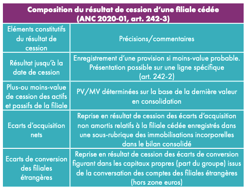 En consolidation française, la cession d’une filiale avec perte de contrôle entraîne sa déconsolidation avec constatation d’un résultat de cession déterminé selon le règlement ANC 2020-01 (art. 242).