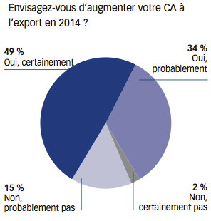 83 % des exportateurs français envisagent d’augmenter leur chiffre d’affaires à l’export en 2014. Ces intentions sont fermes pour 49 % des entreprises interrogées, et probables pour 34 %.