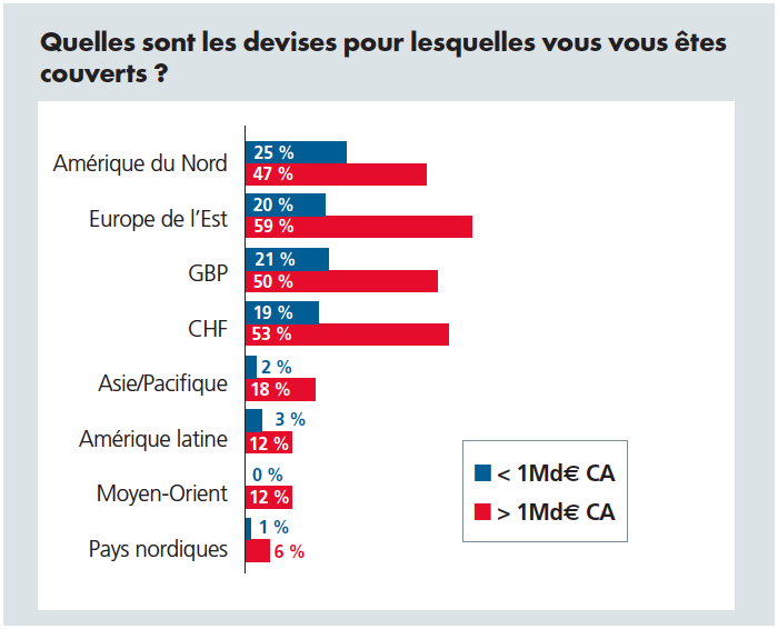 Les entreprises basées en France sont principalement exposées aux variations des devises nord-américaines (dollar ou du dollar canadien). Mais leurs relations commerciales avec des pays proches géographiquement les rend également sensibles aux variations des devises européennes hors zone euro (livre sterling, franc suisse et devises d’Europe de l’Est [forint hongrois, couronne tchèque, rouble biélorusse]). Elles sont également en risque s’agissant des devises asiatiques et sud-américaines, mais dans une moindre mesure car un grand nombre de transactions avec ces pays sont réalisées en dollars.