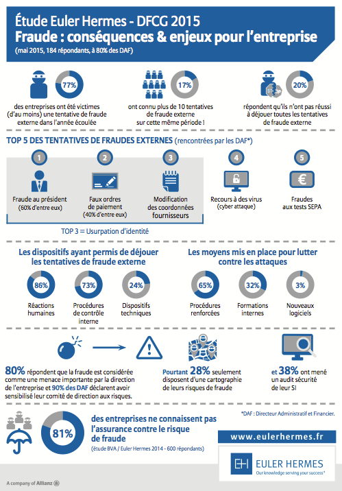 Michel van Swieten, expert fraude, Euler Hermes : C’est exactement ça ! Les entreprises françaises sont victimes, les unes après les autres, de criminels en col blancs, qui enquêtent parfois très longtemps sur leurs « proies » et connaissent parfaitement les rouages internes. Ils cherchent des informations sur les réseaux sociaux, et parviennent à obtenir des données confidentielles en s’introduisant dans les systèmes d’information de l’entreprise. Ils tentent alors plusieurs fois de suite de détourner de l’argent, en usurpant l’identité du président, d’un fournisseur, d’un bon client… L’usurpation d’identité arrive clairement en tête des tentatives de fraude. Le recours à des virus, mentionné dans le top 5 des principales fraudes, est souvent un préalable, pour capter des informations sensibles. Ce phénomène, relativement récent, est piloté des groupes organisés très professionnels, qui œuvrent depuis l’étranger – souvent des pays d’où ils ne peuvent pas être extradés. Quoiqu’il arrive, ils ont évidemment organisé leur insolvabilité, la chance de récupération après une fraude est donc quasi nulle.