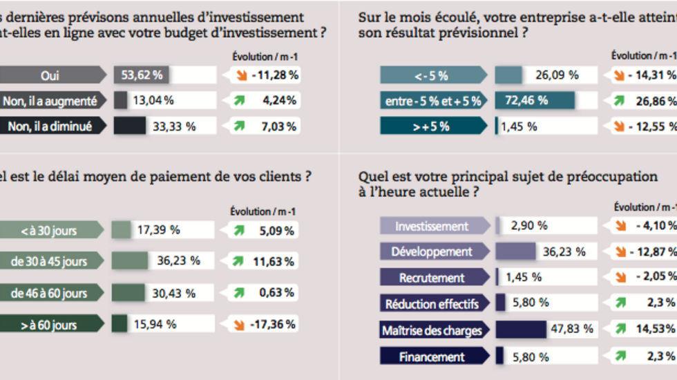 Le baromètre du mois de novembre laisse pourtant transparaître des variations relativement fortes dans les réponses apportées par les sondés (probablement en lien avec une composition du panel significativement différente, notamment en termes de chiffre d’affaires). Les publications de résultats se sont ainsi recentrées autour des prévisions (72,5 % des sondés, le niveau le plus haut depuis octobre 2013), ne laissant plus aucune place aux bonnes surprises (1,5 %, en repli de 12,6 points) et une moindre place aux mauvaises (26,1 %, - 14,3 points). Les préoccupations font également état d’un inversement brutal des priorités, la maîtrise des charges repassant au premier...
