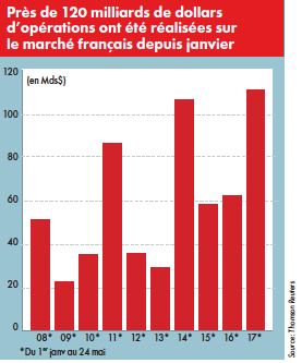 Optimistes mais prudents en début d’année, les banquiers d’affaires se mettent à voir plus grand : et si le cru français 2017 des fusions-acquisitions atteignait, voire dépassait, ceux de 2006 et 2007, les deux années les plus fastes jamais connues ? Il est en effet permis d’y croire : entre le 1er janvier et le 24 mai, près de mille opérations impliquant au moins une contrepartie domestique ont été annoncées d’après Thomson Reuters, pour un montant total de 111,5 milliards d’équivalents dollars. Sur la même période, 124 milliards de dollars de transactions avaient été recensés il y a dix ans et près de 160 milliards en 2006. Ces deux exercices s’étaient finalement achevés avec des volumes de respectivement 302 et 320 milliards environ. Certes, 2017 s’inscrit pour le moment en retrait. Mais un effet de rattrapage est attendu par les banquiers.