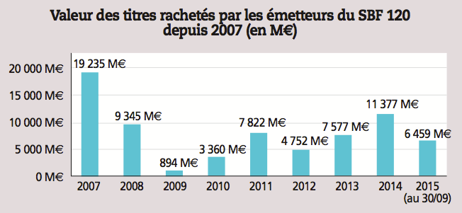 Jeudi dernier, Nokia, en cours de fusion avec Alcatel-Lucent, a annoncé vouloir lancer un programme de rachat d’actions pour 1,5 milliard d’euros à partir de 2016. Une annonce qui s’inscrit dans la tendance observée en France depuis le début d’année. En avril dernier, Michelin faisait part de sa volonté d’acquérir 750 millions d’euros de ses titres. Quelques semaines plus tard c’était au tour d’Airbus d’annoncer un tel programme, après avoir obtenu l’autorisation de son assemblée générale de racheter 10 % de ses titres en circulation. D’autres sociétés, comme JCDecaux au mois de juin, leur ayant emboîté le pas depuis lors, le montant total d’actions rachetées sur les marchés boursiers français devrait être conséquent pour 2015. «Les opérations effectuées depuis le début de l’année se sont élevées à 6,5 milliards d’euros pour les sociétés du SBF 120, calcule Cédric Richard, responsable du corporate broking et de la syndication actions chez Natixis. A titre de comparaison, le montant observé en 2014, corrigé de la taille exceptionnelle du rachat de L’Oréal, avait atteint 5,3 milliards d’euros.»