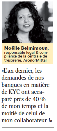 KYC. Depuis quelques années, cet acronyme est synonyme de cauchemar pour bon nombre de financiers. Sous l’effet de l’inflation réglementaire (lois sur la lutte contre le blanchiment et contre le financement du terrorisme, multiplication des embargos internationaux et des interdictions de financement pesant sur certaines personnes…) et des lourdes amendes qu’ont dû acquitter dans le monde de nombreux établissements pour le non-respect de ces textes, les exigences des banques en matière de KYC (know your custumer) se sont drastiquement renforcées, ce au détriment de leurs clients, entreprises notamment. «L’an dernier, en complément des dossiers courants, certains partenaires bancaires ont souhaité mettre à jour leurs informations KYC (informations légales, classification EMIR et Mifid, bénéficiaires directs et ultimes, organigrammes, structure capitalistique des entités et du groupe ArcelorMittal, nom des dirigeants, justificatifs d’identité…), témoigne Noëlle Belmimoun, responsable légal and compliance de la centrale de trésorerie du groupe ArcelorMittal. Ce faisant, nous avons eu à remplir quelque 350 dossiers, un volume colossal. Ces demandes ont accaparé près de 40 % de mon temps et la moitié de celui de mon collaborateur !»