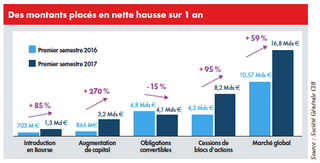 Après un exercice 2016 marqué par une baisse des montants levés ou placés sur les divers compartiments du marché actions français (– 16 %), l’activité s’est sensiblement redressée durant le premier semestre. Les volumes ont en effet avoisiné 17 milliards d’euros sur la période, soit près de 60 % de plus qu’il y a un an à cette époque et presque autant que ceux enregistrés sur l’ensemble de l’année dernière (19,5 milliards) ! «Tant au niveau français qu’au niveau européen, le cru 2017 s’annonce comme l’un des meilleurs depuis une décennie», signale Igor Donnio, responsable ECM France chez BNP Paribas. Un constat qui réjouit d’autant plus les banquiers que l’ensemble des segments profite de cette tendance. «Au cours des dernières années, l’activité était le plus souvent tirée par un ou deux produits entre les introductions en bourse, les augmentations de capital, les émissions d’obligations convertibles et les ventes de blocs, rappelle Alexis Le Touzé, co‑responsable ECM France chez Société Générale CIB. Actuellement, les quatre bénéficient de l’environnement porteur.»