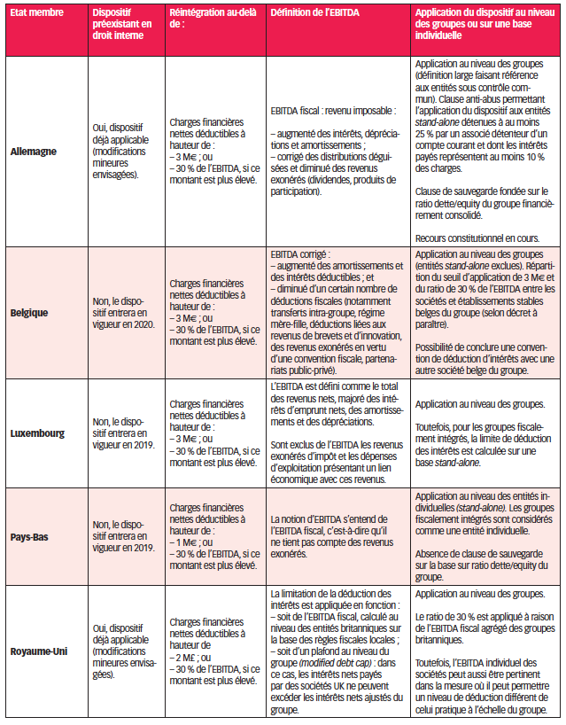 Si certains Etats membres ont d’ores et déjà une réglementation équivalente qui ne nécessiteraient que des ajustements mineurs pour s’aligner sur la directive, nombreux sont ceux qui doivent encore transposer la règle de limitation de la déductibilité des charges financières.