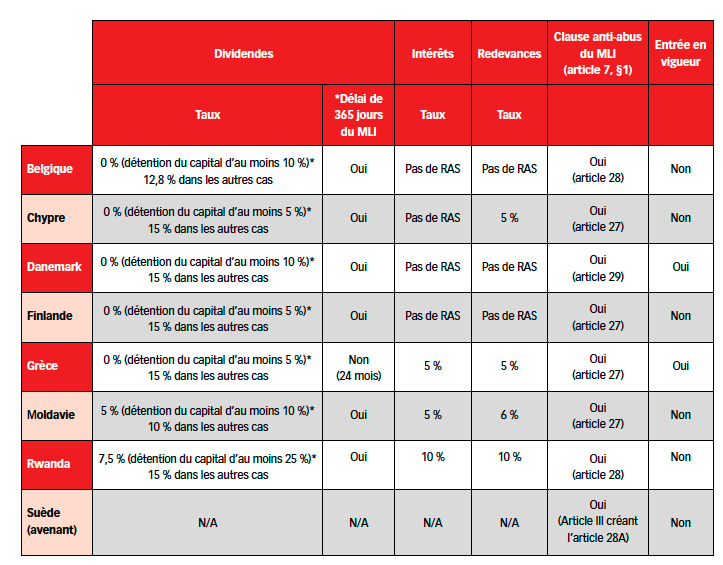 6. La Belgique a déposé son instrument de ratification de l’IM le 26 juin 2019 (entrée en vigueur le 1er octobre 2019), Chypre le 23 janvier 2020 (entrée en vigueur le 1er mai 2020), le Danemark le 30 septembre 2019 (entrée en vigueur le 1er janvier 2020), la Finlande le 25 février 2019 (entrée en vigueur le 1er juin 2019) et la Grèce le 30 mars 2021 (entrée en vigueur le 1er juillet 2021). La Moldavie et le Rwanda ne sont pas des Etats signataires de l’IM. On notera par ailleurs que contrairement à la France, la Suède n’avait pas inclus la convention franco-suédoise dans ses conventions couvertes. En tout état de cause, la Suède a déposé son instrument de ratification de l’IM le 22 juin 2018 (entrée en vigueur le 1er octobre 2018).